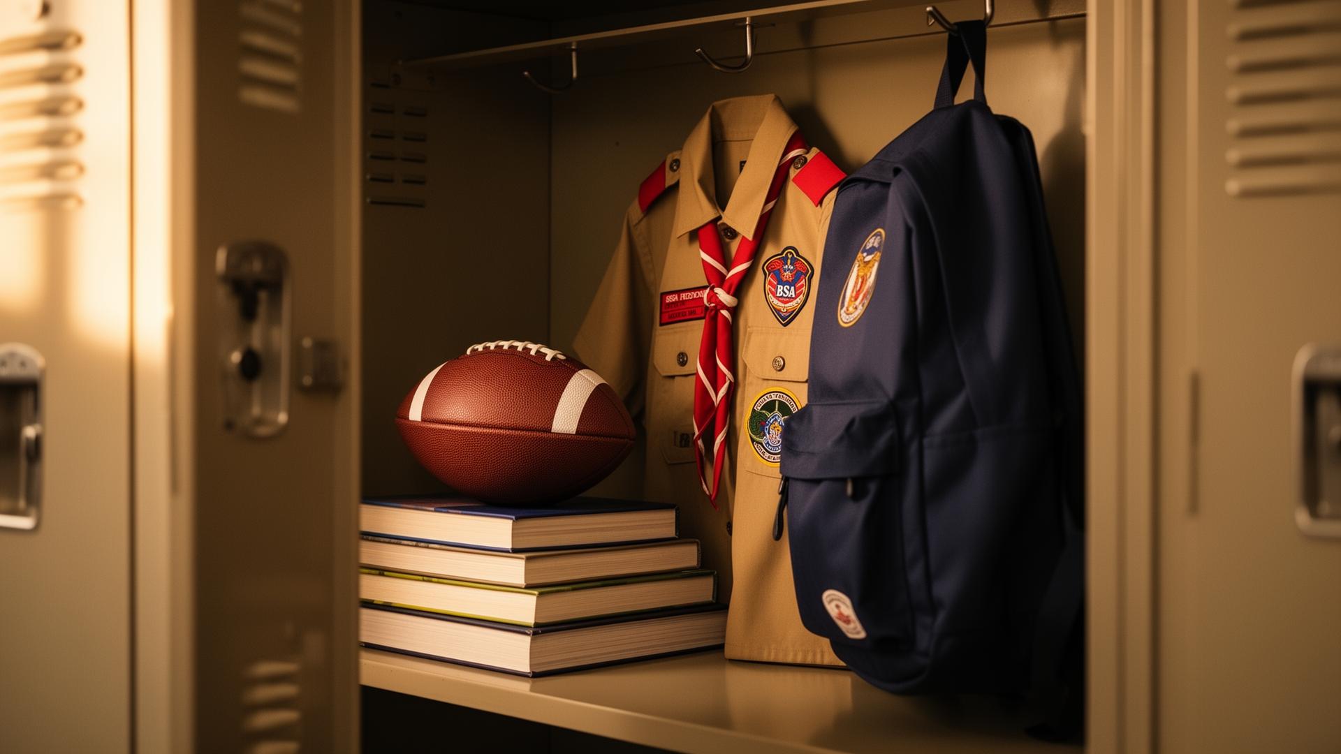 Open up your child's locker and you'll usually find the answer already taped to the door. Schoolbooks on the shelf. A football resting on top. A backpack on one hook, and — if we've done our job right — a Scout uniform hanging right next to it. None of those things are competing. Each one is shaping a different part of who your Scout is becoming.